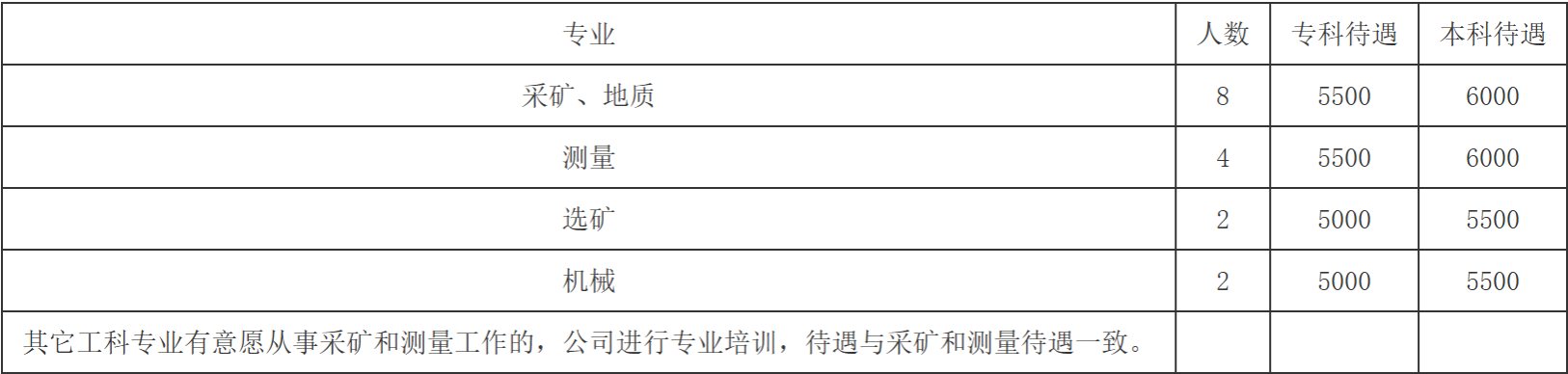 2.专业要求:采矿、地质(地质工程、勘察技术与工程、资源勘查工程)、测量、机电、选矿、通风、爆破工程、安全工程等专业及相近专业。