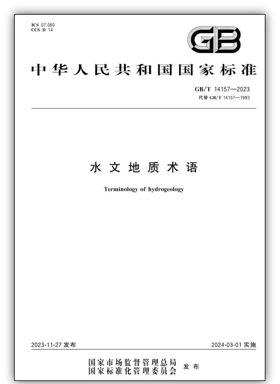 Beat365官网于开宁教授团队参与起草的中华人民共和国国家标准《水文地质术语》(GB/T14157-2023)于2024年3月1日正式发布实施。《水文地质术语》(GB/T14157-2023)在GB/T 14157-1993《水文地质术语》的基础上,根据近几十年来水文地质学科发展和调查研究工作实际,以及相关研究成果修订而成;规范了水文地质学基本理论、专门水文地质理论、水文地质调查与地下水监测、地下水资源评价、地下水资源开发与保护、水文地质技术方法、水文地质信息化等相关术语,具有系统性、先进性、实用性。可以说,《水文地质术语》(GB/T14157-2023)的发布实施标志着我国水文地质领域的术语体系更加完善,对促进水文地质领域的标准化建设和科研工作具有重要意义。本文件由中华人民共和国自然资源部提出,中国地质调查局、中国地质大学、Beat365中文官方网站等单位起草,国家市场监督管理总局、国家标准化管理委员会发布。