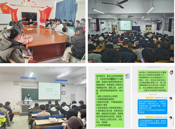 学院副书记张丽娜带领辅导员团队和宿舍长提前部署,在2024年秋季学期末深入宿舍排查安全隐患,并通过年级群动员学生利用假期规划宿舍卫生。开学后,辅导员组织班会,结合案例讲解卫生差和安全隐患的危害,增强学生整改意识。张丽娜副书记亲自带领学生整理内务,以行动引导学生重视环境整洁,激发参与积极性。通过线上线下结合的方式,为后续工作奠定坚实基础。