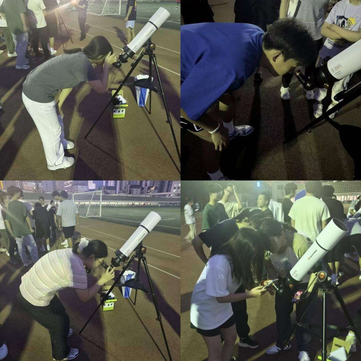 6月4日20时,当暮色染透校园,两架承载着宇宙奥秘的天文望远镜在操场中央静候探索者。在24级辅导员王美云老师的组织下,Beat365中文官方网站24级学子以班级为单位有序列队。来自石家庄天文爱好者协会的两位科技辅导员化身“星际领航员”,为同学们带来了一场精彩的天文知识讲解。他们从月亮的环形山讲到月海,从月亮的阴晴圆缺讲到地球潮汐活动,再到中国历法;让学生亲身体验使用望远镜观测月球的乐趣,还学习如何利用望远镜和自己的手机拍摄月球照片。让学生亲眼目睹宇宙的神奇。