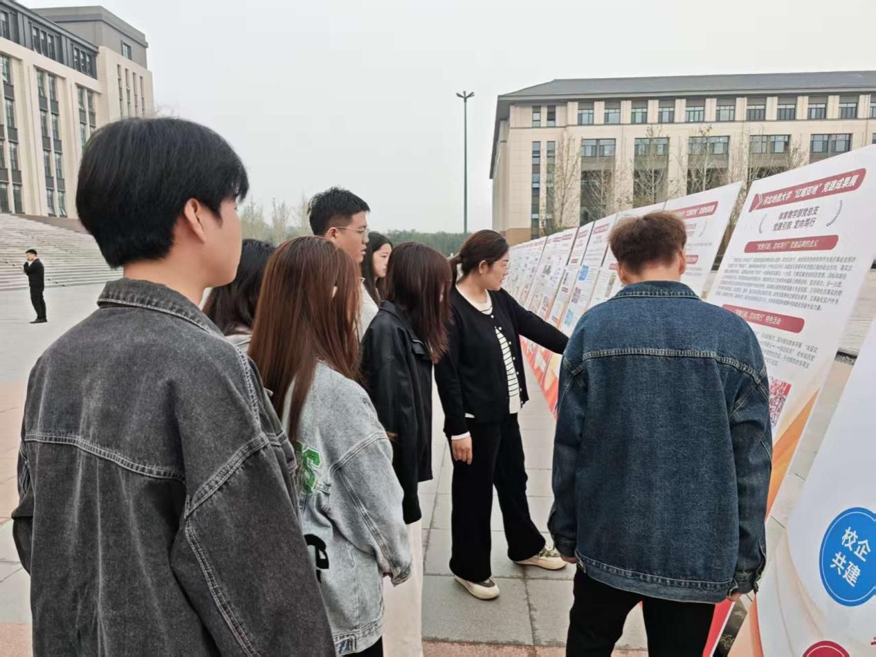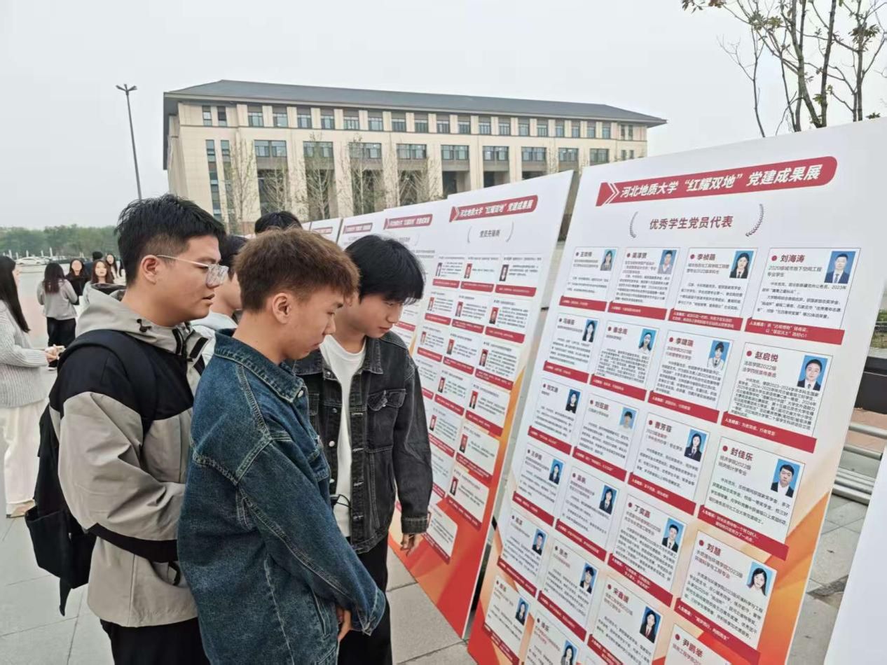 活动伊始,张丽娜副书记结合展板内容,系统讲解了学校党委围绕“服务地质行业、服务地方发展”的“双地”办学定位,实施 “1566”党建工程,打造“红耀双地”党建品牌的丰硕成果。同时,她围绕学院党建根基夯实、党建制度完善、党建活动开展及党建特色培育等方面,详细介绍了学院响应学校“红耀双地”党建品牌建设的具体举措与实际成效。在随后的自由参观环节,学生党员们三五成群驻足研讨,有的拍摄展板内容留存学习,有的分享自身感悟与思想收获,现场学习氛围浓厚热烈。