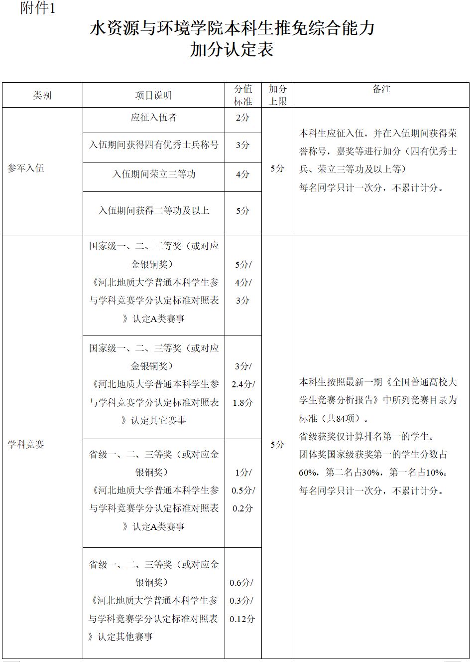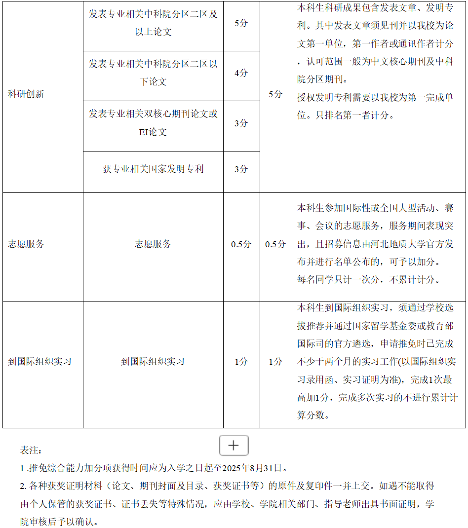 各学院从学生全面发展的角度制定综合能力评分标准,将申请学生参军入伍、参加学科竞赛获奖、发表论文或取得授权发明专利、志愿服务、到国际组织实习等纳入指标体系,设置《Beat365中文官方网站本科生推免综合能力加分认定表》(附件1),学院实施细则中各类别加分上限不得超过学校发布的综合能力加分认定指导意见的各项加分上限,加分学生在某一方面有多项加分情况时,原则上只取一项加分。综合能力各项成绩之和不超过15分。