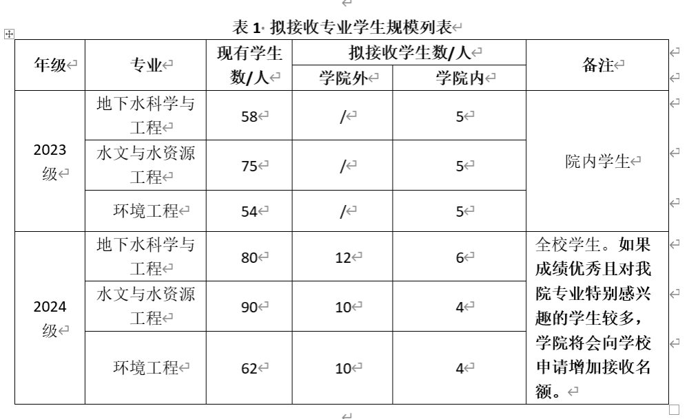 2023级、2024级Beat365官网地下水科学与工程专业、水文与水资源工程专业、环境工程专业拟接收转入学生61人,具体各专业分配情况见表1。